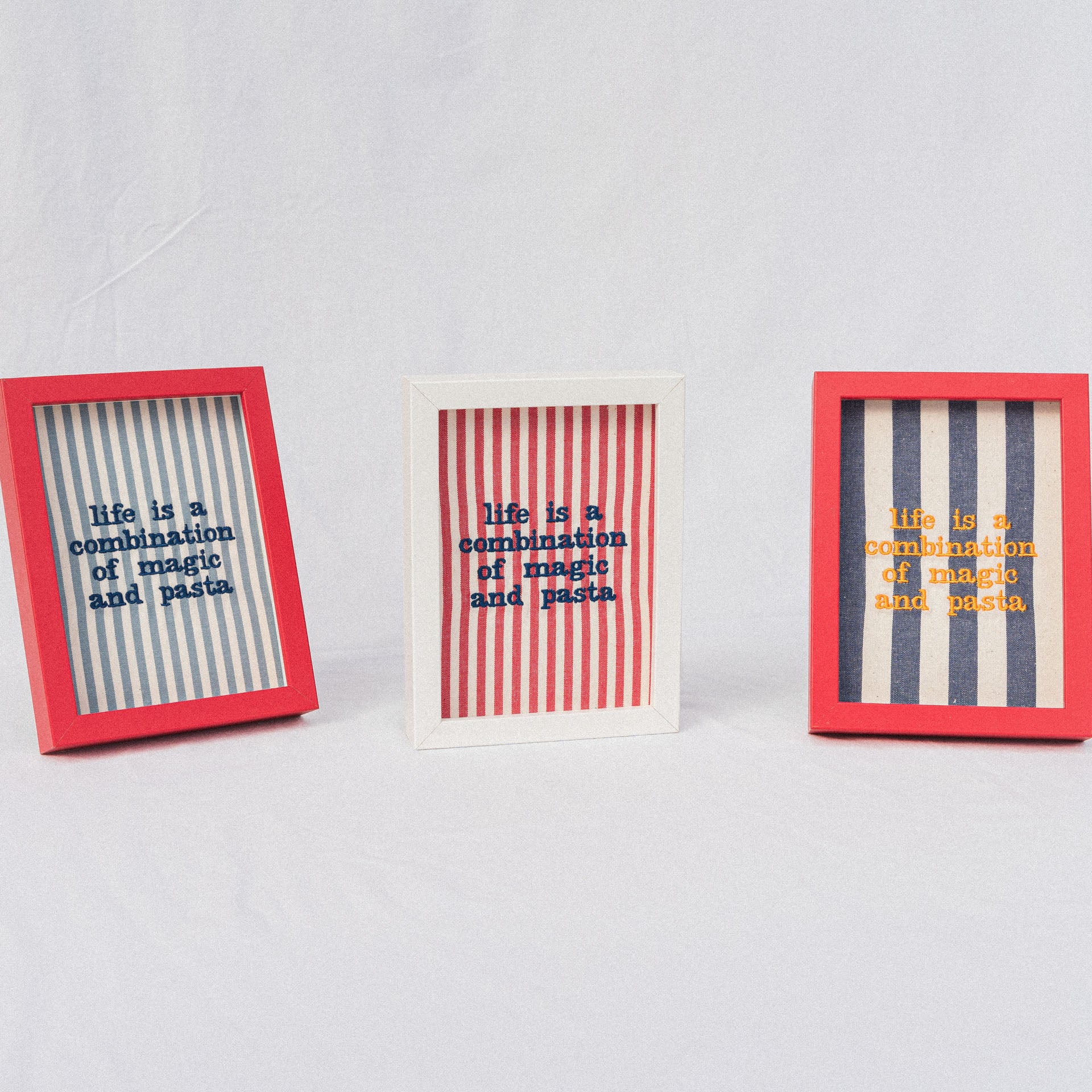 aggiungi personalità e un tocco di positività ai tuoi spazi con i nostri quadretti. ogni pezzo è caratterizzato da un cartoncino ricoperto di stoffa e ricamato con una frase, pensata per ispirarti e per portare una ventata di ottimismo nella tua quotidianità. perfetti per ogni ambiente – dalla stanza da letto al soggiorno, dallo studio all'ingresso – i nostri quadretti sono un'idea regalo originale e sentita, capace di comunicare emozioni e messaggi speciali.