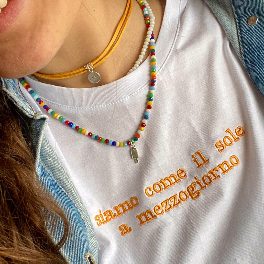 personalizzala con un ricamo esclusivo: puoi aggiungere il tuo nome o una frase breve per rendere la t-shirt davvero tua. Il risultato è un dettaglio delicato ma distintivo, che dona personalità senza essere troppo appariscente.